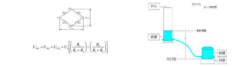 壓阻傳感器采用電阻全橋結(jié)構(gòu),如圖所示:A、C端接直流電源,B、D端為壓阻傳感器輸出的電壓。再通過A/D芯片將輸出的模擬電壓經(jīng)過處理放大轉(zhuǎn)換成數(shù)字信號。MCU采集到相應(yīng)的參數(shù)之后,通過存儲芯片上標(biāo)定系數(shù)擬化出所受壓力值。為保證測量的準(zhǔn)確性,在每次測量前調(diào)零使電橋平衡,即使UBD=0。