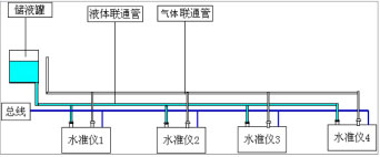 工作原理:各沉降監(jiān)測點(diǎn)安裝壓阻式靜力水準(zhǔn)儀,并需要在一相對不動點(diǎn)安裝基準(zhǔn)罐。傳感器之間通過高強(qiáng)度的氣壓管聯(lián)接一起匯入到基準(zhǔn)罐,每個(gè)水準(zhǔn)儀內(nèi)部都安裝有高精硅壓傳感器,在基準(zhǔn)罐與傳感器之間充滿液體介質(zhì),水準(zhǔn)儀內(nèi)的壓力傳感器感測到的是該點(diǎn)到基準(zhǔn)罐液體表面的壓力,該壓力與液面高度有一定線性關(guān)系。如果壓力傳感器感測到壓力發(fā)生變化即說明該點(diǎn)與基準(zhǔn)液面之間的高差發(fā)生變化,根據(jù)出廠前的壓力變化量與液面高差的標(biāo)定線性表,靜力水準(zhǔn)儀內(nèi)部的單片機(jī)可以計(jì)算出高差變化值。根H=P/ρ*g計(jì)算出從測點(diǎn)到基準(zhǔn)點(diǎn)液面到傳感器高度。原理示意圖如下: