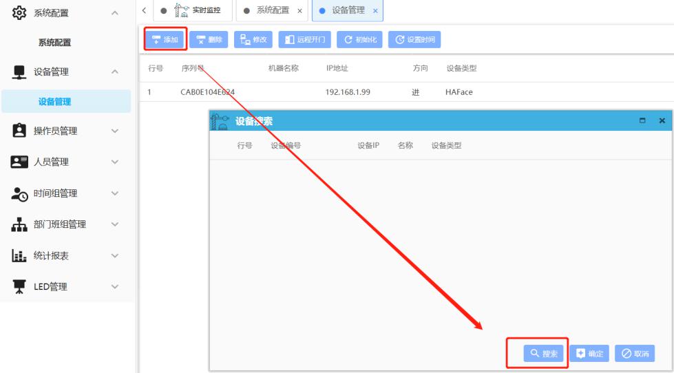 首先需要把人臉設備添加到系統中。人臉設備出廠IP默認為192.168.1.88,添加設備前請確保管理電腦的IP網段與終端設備一致。添加設備后請修改設備參數,配置設備IP、位置及進出方向參數。遠程開門需先選擇對應的設備序列號。