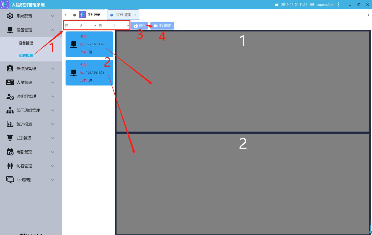 ◆實時視頻:實時監控出入口動態:設備在線點擊實時視頻,根據設備數量,選擇相應的行數和列數,點擊保存,從左邊把對應的拖到右邊對應的框里,然后點實時畫面。